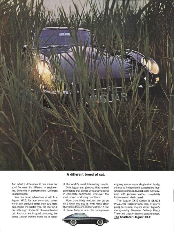 Para um futuro arqueólogo, decifrar nossas publicidades pode se revelar uma tarefa fascinante. As páginas da Car and Driver, comparadas a outras revistas de grande circulação como Life ou mesmo National Geographic, parecem bem sem graça, quase monocromáticas. Este anúncio para a lendária Jaguar E-Type, uma das raras em cores, se destaca por sua elegância. Descobrimos rapidamente que essa beleza pode alcançar mais de 210 km/h. Na época, o preço de 5.625 dólares para o coupé, e 5.425 dólares para o roadster, era um verdadeiro presente considerando seu desempenho.